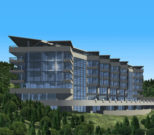 Hotel at the Black Sea. Besides the entrance hall, rooms and a restaurant, there is a conference hall, pool, gym, alley, sauna, Turkish bath and Finish bath.
