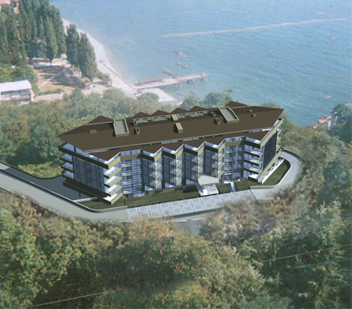 Hotel at the Black Sea. Besides the entrance hall, rooms and a restaurant, there is a conference hall, pool, gym, alley, sauna, Turkish bath and Finish bath.