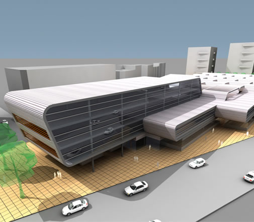 Green market in the centre of the city with the stalls in the middle and the shops outside, towards the streets. The main building has four floors, there are offices, shops and halls. The underground garage has two levels, one of which is for tradesmen the other being for customers.