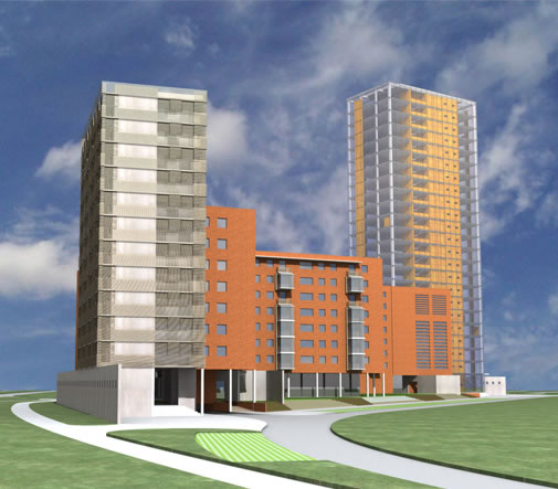 Mixed-use complex. The residential part is in the middle, horizontally developed, whereas the business part is at the two opposite ends of the stretched block, vertically developed. The system of project is following the existing pattern of the rest of the block.