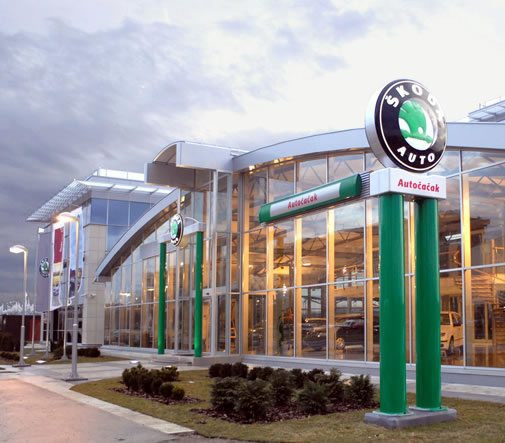 The complex consists of three buildings, one of which is a car show room, second is an office building with a car workshop at the ground floor and underground garage and there is a bank in third building. The car show room was built according to the Skoda company standards.