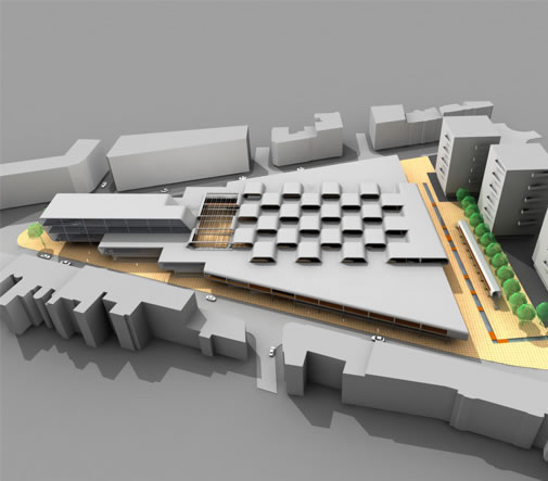 Green market in the centre of the city with the stalls in the middle and the shops outside, towards the streets. The main building has four floors, there are offices, shops and halls. The underground garage has two levels, one of which is for tradesmen the other being for customers.