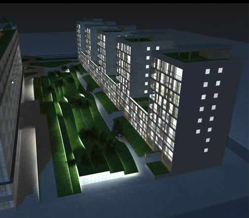 Mixed-use block with a clearly defined areas for residential and business purpose. In the middle of the two buildings is a park with rolling hills with shops, bakery, cafeteria and a day care connecting the residential and business part of the block.