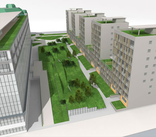 Mixed-use block with a clearly defined areas for residential and business purpose. In the middle of the two buildings is a park with rolling hills with shops, bakery, cafeteria and a day care connecting the residential and business part of the block.
