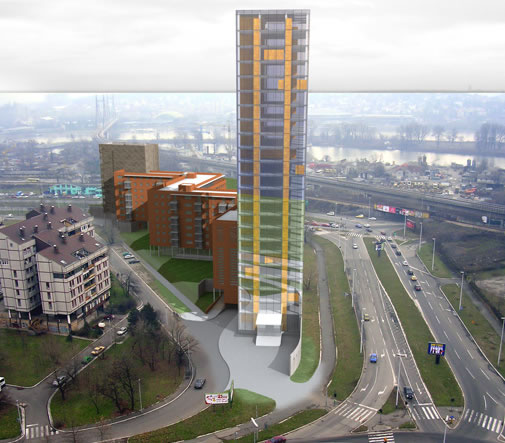 Mixed-use complex. The residential part is in the middle, horizontally developed, whereas the business part is at the two opposite ends of the stretched block, vertically developed. The system of project is following the existing pattern of the rest of the block.
