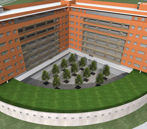 Mixed-use complex. The residential part is in the middle, horizontally developed, whereas the business part is at the two opposite ends of the stretched block, vertically developed. The system of project is following the existing pattern of the rest of the block.