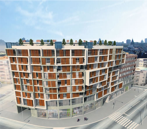 Residential building in the heart of the city with the river views, roof gardens and the park next to the building. 103 flats and 17 serviced apartments, shops at the ground floor and a 3 level underground garage.