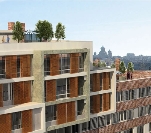 Residential building in the heart of the city with the river views, roof gardens and the park next to the building. 103 flats and 17 serviced apartments, shops at the ground floor and a 3 level underground garage.